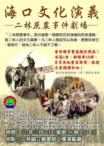 【海口文化演義】公演,於12月11日晚上6:30假二林鎮立圖書館二樓演藝廳演出!備有豐富摸彩品,歡迎大家蒞臨指導!