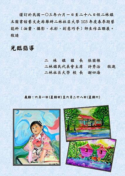 謹訂於103年6月1~28日假二林鎮立圖書館藝文走廊舉辦二林社區大學103年度春季期藝能科《油畫、攝影、水彩、創意巧手》師生作品聯展。